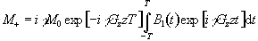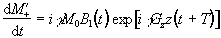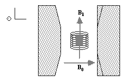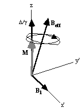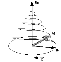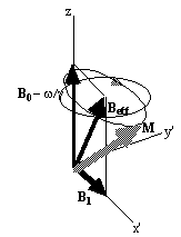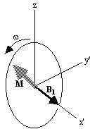 Now, as well as the static B0 field applied along z, consider a time varying field B1, applied perpendicularly to B0 and oscillating at w0. If only the circularly polarised component of B1 rotating in the same direction as the precessing magnetisation vector is considered