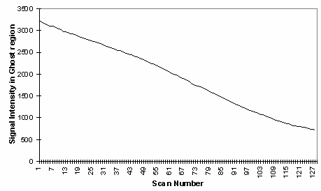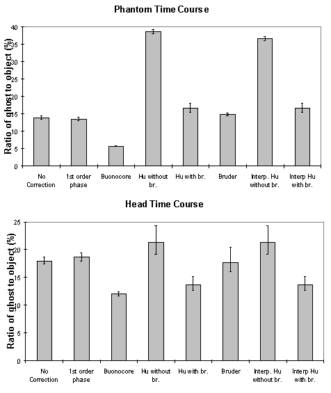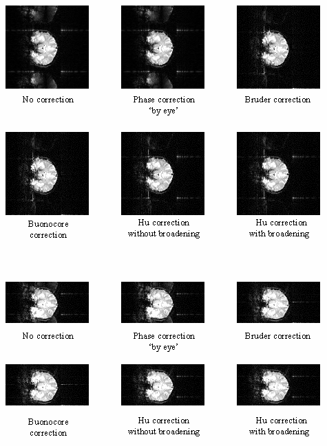All the above techniques, apart form the Buonocore method, will not correct phase errors that change with time. Since changes in the ghost do occur with time, adaptations of the above techniques are needed if they are to deal with such situations. If ghost only and object only regions can be defined, as is the case if the object does not fill the field of view, then a zeroth or first order alternate line phase correction can be applied which minimises the signal in the ghost region relative to the object region. This technique can work very well in some cases, however if there is any overlap of image and ghost, then the minimisation can occasionally produce obviously incorrect results. Alternatively, the ghost can be minimised by eye on the first image in the set, and then the zeroth and first order phase corrections used to minimise the sum of the square difference between subsequent images and the first. This technique again can generate ridiculous solutions, particularly since this correction has to be carried out before motion correction has been applied. If the assumption is made that the phase errors change linearly with time then a calibration scan can be obtained before and after the fMRI experiment, phase correction calculated, and a linear interpolation of the two angles used to correct intermediate images.