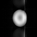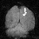 In fMRI, ghosting artefact can cause a number of problems. In the first place, the ghosting can spoil the look of the image, and ghosting of activated regions could lead to apparent 'activation' appearing outside the head. More serious effects occur if the artefact changes with time. Movement of the subjects head causes the interference fringes, of overlapping ghost and image, to change dramatically, with even small displacements having a large effect. Since subject motion is often stimulus correlated, particularly if the experimental paradigm involves movement, the changes of the interference pattern can show up in the statistical analysis as 'activation', as shown in Figure 4.6. It has also been observed on our scanner that the ghosting can change with time as shown in Figure 4.7, from an experiment lasting eight minutes. This probably results from changes in the switched gradient waveform as the coil heats up and its resistance increases.