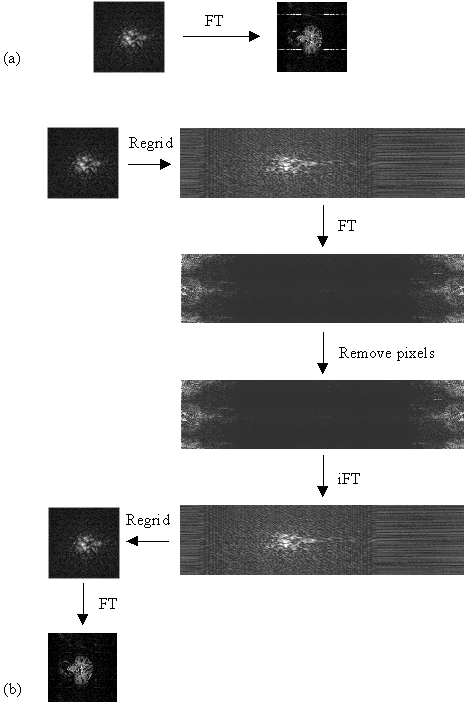 As described in section 2.5.3, external r.f. radiation can cause bright dots of artefact to appear in the image. Provided that this interference is at a single discrete frequency, and the sampling is linear, only one or two pixels in the image will be affected and the image can be cleaned up by replacing these pixels by the average of their neighbours. Non-linear sampling however means that the single frequency interference is spread over a wide range of frequencies after Fourier transformation, and consequently appears as a line in the image. Not only does such interference spoil the appearance of the images, fluctuations in its intensity can cause problems with the analysis of the data. In order to cosmetically remove the interference in such a case, it is easier to re-grid the data, such that it appears that it was linearly sampled, and then to remove the few pixels which now contain the interference. The process is illustrated in Figure 4.12.