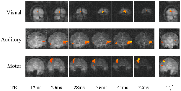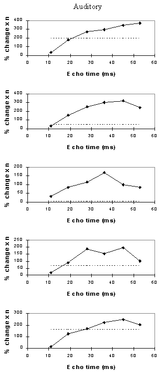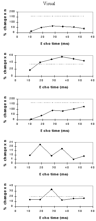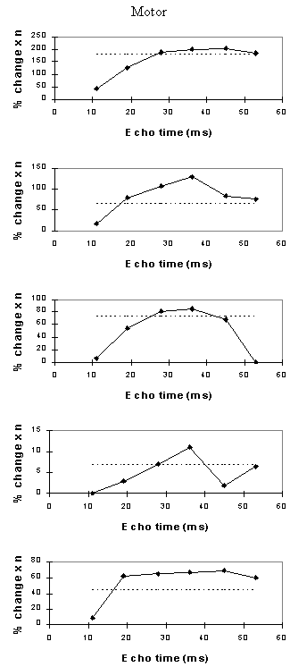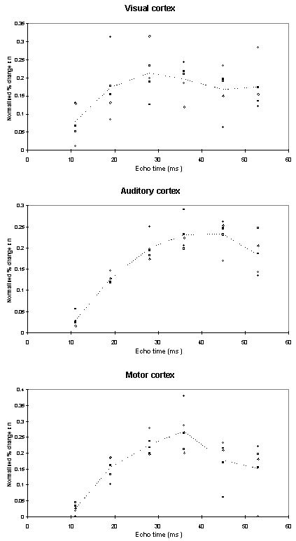 An appropriate choice of echo time for the motor and auditory cortices, would appear to be between 30 and 40 ms, and between 25 and 35 for the visual cortex. If the echo time is too short, the percentage change is so small that the activation response is lost in the contrast to noise of the time series. However if the echo time is too long, the signal from the cortex has fallen to zero due to T2* decay and no change is seen on activation.