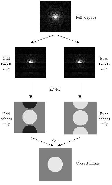 An alternative method that requires no reference scans has been proposed by Buonocore [8]. If two images are constructed, one from only the odd echoes, with the even echoes zero filled prior to Fourier transformation, and one from only the even echoes, with the odd echoes zero filled, then both images will display ghosting, one with a positive ghost, and one with a negative ghost (see Figure 4.8). If there were no phase errors in the odd and even echoes then the phase difference in the object only region (that is where there is no ghost) between these two images would be zero. However if there are phase errors, then a phase difference between equivalent points in the odd and even image of 2q(x,y) can be detected. If the ghost and image do not overlap, it is possible to add the two images together, having applied an appropriate phase correction to one, to form a ghost free image. However if they do overlap then the phase differences are calculated as a function of x only (that is along the read direction) and averaged through all the lines in the object only region as defined by the user. Having determined the phase difference, the original time data can be corrected by Fourier transformation in the read direction, multiplying the odd lines by exp(iq(x)) and the even lines by exp(-iq(x)).