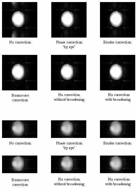 The above five methods were tested on both phantom and head data, with objects that fill and half-fill the field of view. Examples of their ability to correct the ghosting are shown in Figure 4.9a-b. Most of the corrections reduce the ghosting partially in the phantom images. Where the ghost and object overlap, the Hu correction with broadening is slightly better at reducing the ring the edge of the ghost.