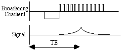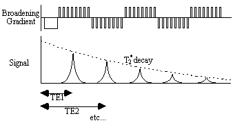 In EPI, a gradient echo is formed in the broadening direction by applying an initial dephasing gradient, and then a series of 'blips' of the opposite polarity which form the echo. The time from the r.f. excitation pulse to the centre of the echo is defined as the echo time in EPI (see Figure 4.1). This is distinct from the repeated set of echoes formed by the switching of the read gradient.