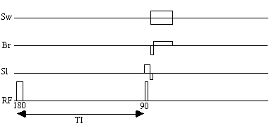 The pulse sequence diagram for a standard inversion recovery experiment is shown in Figure 4.14. At 3.0 Tesla the values of the inversion time, TI, required are 400 ms and 1200 ms for white matter null, and grey matter null respectively.