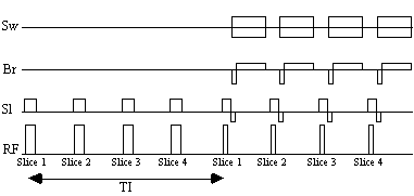 Acquiring the reference set, with a suitable number of repeats to gain sufficient signal to noise, can take several minutes. Much of this time is taken up by the inversion time delay. The fast inversion recovery sequence uses this time to invert other slices, before going back to image them, as shown in Figure 4.15.